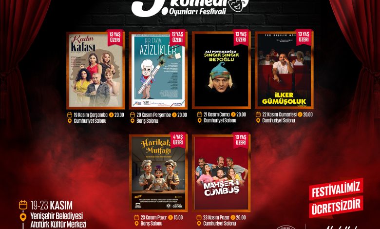 Mersin Yenişehir Belediyesi, bu yıl düzenlediği kültür ve sanat etkinliklerine bir yenisini daha ekleyerek 5.Yenişehir Komedi Oyunları Festivali’ni tiyatroseverlerle buluşturuyor. 19–23 Kasım tarihleri arasında gerçekleştirilecek festivalde, 6 farklı oyun sahnelenecek. Gösterimlerin tamamı Yenişehir Belediyesi Atatürk Kültür Merkezi’nde yapılacak ve ücretsiz olacak. Yenişehir Belediye Başkanı Abdullah Özyiğit, tüm Mersinlileri festivale davet etti.