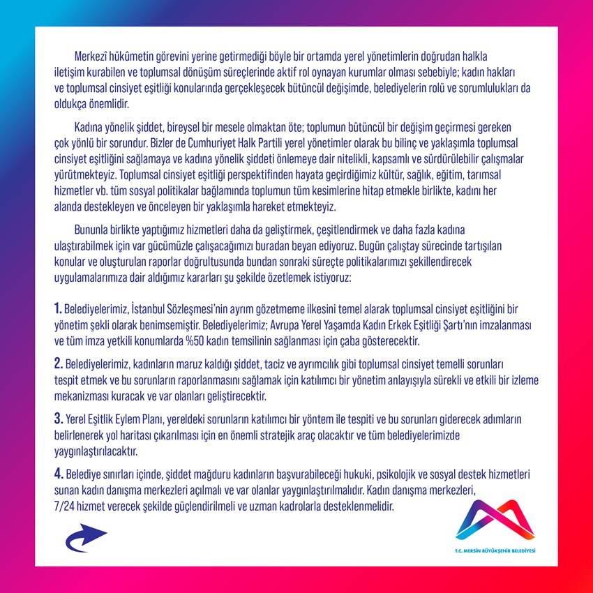 15 maddeden oluşan sonuç bildirgesinde ana hatlarıyla CHP’li Belediyelerde; İstanbul Sözleşmesi’nin ayrım gözetmeme ilkesini temel alarak belediyelerin toplumsal cinsiyet eşitliğini bir yönetim şekli olarak benimsedikleri ve ‘Avrupa Yerel Yaşamda Kadın Erkek Eşitliği Şartı’nın imzalanması, kadınların maruz kaldığı toplumsal cinsiyet temelli sorunların tespiti ve raporlanması, Yerel Eşitlik Eylem Planı ile yerelde yapılacak çalışmaların temel stratejisini belirleme ve izlenebilirliğini sağlama, şiddet mağduru kadınların başvurabileceği Kadın Danışma Merkezleri’nin açılması konu başlıkları üzerine kararlar alındı. Kadınların iş gücü piyasasına katılımını destekleyerek, ekonomik bağımsızlığının sağlanması, belediyelerin karar alma mekanizmalarında kadınların daha fazla yer almasının sağlanması, toplumsal cinsiyete duyarlı bütçe uygulanması da önemli maddeler arasında yer alıyor. Kadınların yoğun olarak kullandığı alanların güvenli hale getirilmesi, engelli kadınlara yönelik mesleki eğitim kursları açılması, var olanların yaygınlaştırılması, çocuk yaştan itibaren cinsel sağlık eğitimi verilmesi ve kadın sağlığı tarama alanları oluşturulması, kız çocukların eğitime devam edebilmesi ve çocuk işçiliğinin önlenmesi üzerine de önemli kararlar alındı.
