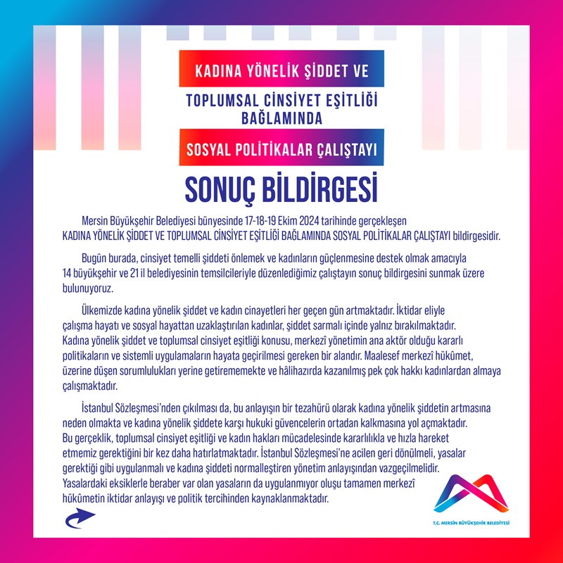 Cumhuriyet Halk Partisi tarafından, Mersin Büyükşehir Belediyesi’nin ev sahipliğinde düzenlenen ‘Kadına Yönelik Şiddet ve Toplumsal Cinsiyet Eşitliği Bağlamında Sosyal Politikalar Çalıştayı’ tamamlandı.