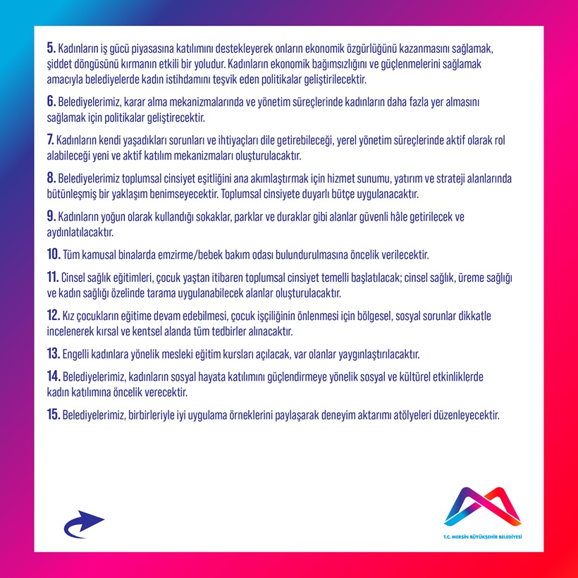 Kadınların iş gücü piyasasına katılımının desteklenerek ekonomik bağımsızlıklarını elde etmeleri, belediyelerin karar alma mekanizmalarında kadınların daha fazla yer almasının sağlanması, toplumsal cinsiyete duyarlı bütçe uygulanması da önemli maddeler arasında yer aldı. Kadınların yoğun olarak kullandığı alanların güvenli hale getirilmesi, engelli kadınlara yönelik mesleki eğitim kursları açılması, çocuk yaştan itibaren cinsel sağlık eğitimi verilmesi ve kadın sağlığı tarama alanları oluşturulması, kız çocuklarının eğitime devam edebilmesi ve çocuk işçiliğinin önlenmesi üzerine de önemli kararlar alındı.
