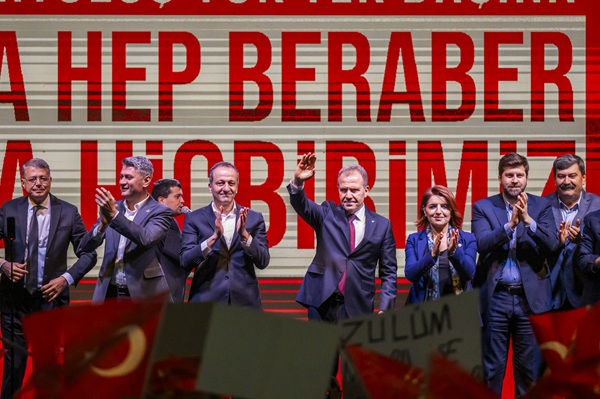 Kentin dört bir yanından gelen yurttaşların alanı doldurduğu dayanışma mitinginde coşkulu kalabalık ellerinde, ‘Karanlık ne kadar derinse şafak o kadar yakındır’ , ‘Hak, hukuk, adalet’ , ‘Gücünüz yetmez çünkü biz milletiz’ , ‘Kurtuluş yok tek başına hep beraber ya hiçbirimiz’ , ‘CHP başaracak milletin hakkı milletin olacak’ , ‘19 Mart darbesine teslim olmayacağız’ yazılı dövizler taşıdı. Mersin’den yükselen sloganlar dayanışmanın ve birliğin sesi oldu.
