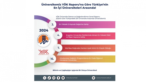 Üniversitemizin gösterdiği üstün başarıların, Mersin Üniversitesi ailesi için büyük bir gurur kaynağı olduğunu dile getiren Rektörümüz Prof. Dr. Erol Yaşar, “Bizleri gelecekteki çalışmalarımız için daha fazla motive eden bu başarılardan dolayı büyük bir mutluluk ve gurur duyuyoruz. YÖK’ün yayınladığı “Üniversite İzleme ve Değerlendirme Genel Raporu-2024” kapsamında, e-kaynak sayısı açısından ülkemizin en zengin beş üniversitesinden biri olmamız, öğrencilerimize ve çalışanlarımıza sunduğumuz bilimsel kaynaklara erişim olanaklarının bir göstergesi ve araştırmaya verdiğimiz önemin somut bir yansımasıdır. Bilgiye erişimde sağladığımız bu zenginlik, akademik başarılarımızı daha da ileri taşıyacak güçlü bir temeldir. Bunun yanı sıra uluslararasılaşma alanında ilk 20 üniversite arasında yer alarak öğrencilerimizin küresel dünyada rekabet edebilme yetkinliklerini geliştirmelerine katkı sağlıyor olmaktan da büyük memnuniyet duyuyoruz. Erasmus gibi değişim programlarına verdiğimiz destek, gençlerimizin sadece akademik değil, kişisel gelişimlerine de katkı sağlayarak onları geleceğe hazırlamaktadır.” dedi.