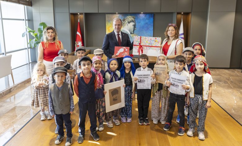 Yöresel ve dönemsel kıyafetlerle Mersin Büyükşehir Belediyesi Hizmet Binası’na gelen minik öğrenciler, ellerinde Atatürk posterleri ve temsili gazete nüshalarıyla ‘Yazıyor, yazıyor! Cumhuriyet ilan edildi!’ nidaları eşliğinde binaya giriş yaptı. Büyük bir coşkuyla Cumhuriyet’in ilanını anımsatan öğrenciler, kendi hazırladıkları ‘Cumhuriyet ilan edildi’ temalı nostaljik gazeteleri belediye personeli ile paylaştı. Minikler, ziyaretin sonunda Başkan Seçer’e de içeriğini kendi hazırlamış oldukları gazeteyi takdim etti. Öte yandan veliler ise atıl durumdaki bir pankartı yeniden düzenleyip, üzerine “Cumhuriyeti Biz Böyle Kazandık” yazısını ekleyerek görüşmeye katıldı.